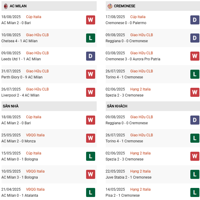 Về phía Cremonese, họ tuy có chuỗi 4 chiến thắng trong 10 trận gần đây nhưng phần lớn đến từ Serie B và các trận giao hữu ít sức ép. Khi gặp đối thủ mạnh, Cremonese thường lộ rõ hạn chế, minh chứng là thất bại 1-4 trước Torino. Phong độ sân khách cũng thiếu ổn định khi nhận 3 thất bại trong 5 lần du đấu gần nhất. Việc phải làm khách tại San Siro ngay vòng mở màn, trước một Milan đang quyết tâm khởi động mạnh mẽ, rõ ràng là thử thách quá lớn.