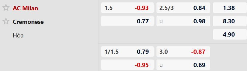 Thông tin tỷ lệ kèo AC Milan vs Cremonese: