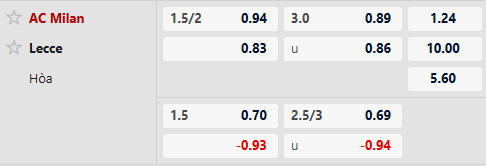 Thông tin tỷ lệ kèo bóng đá AC Milan vs Lecce: