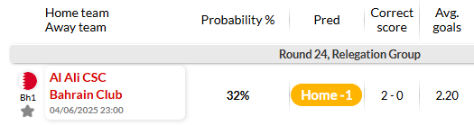 Al Ali CSC và Bahrain SC khép lại mùa giải 2024/25 với thành tích nghèo nàn. Cụ thể, họ lần lượt đúng ở các vị trí thứ 9 và 10 với cùng 23 điểm sau 22 trận. Đây là những vị trí có mặt ở bảng đấu playoff trụ hạng cùng với 2 đội bóng hạng 2 Bahrain là Isa Town và Al Hala. Trở lại với vòng bảng playoff trụ hạng, Al Ali CSC và Bahrain SC có khỏi đầu nhạt nhòa khi chỉ giành được 1 điểm, dù thi đấu trên sân nhà.