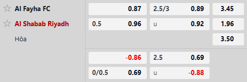 Được thi đâu trên sân nhà nhưng đứng dưới đối thủ ở bảng xếp hạng nên Al-Fayha vẫn bị đánh giá là đội cửa dưới với kèo được chấp +1/2. Thế nhưng phong độ du đấu của Al-Shabab hiện đang khá thất thường trong khi Al-Fayha lại có phong độ tốt ở các trận sân nhà gần đây nên rất có thể đội chủ nhà sẽ không để thua ở lần đối đầu này.