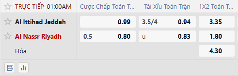 Mặc dù phải làm khách trước nhà ĐKVĐ của giải đấu, những người cũng đang có phong độ rất cao nhưng Al Nassr vẫn nhận được đánh giá rất cao khi chấp dao động từ 1/2 đến 3/4 trái. Đây là tỷ lệ đã xuất hiện ở trận đối đầu gần nhất, khi Al Nassr đánh bại Al Ittihad ở bán kết Siêu cúp Saudi Arabia cách đây một tháng. Tính xa hơn, 2 trận đối đầu gần nhất chấp 3/4 trái như trận này, Al Nassr đều giành chiến thắng.