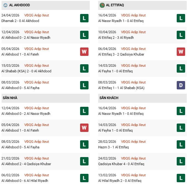 - Trên sân nhà, Al Okhdood thắng 1, thua 1 trước Al Ettifaq.