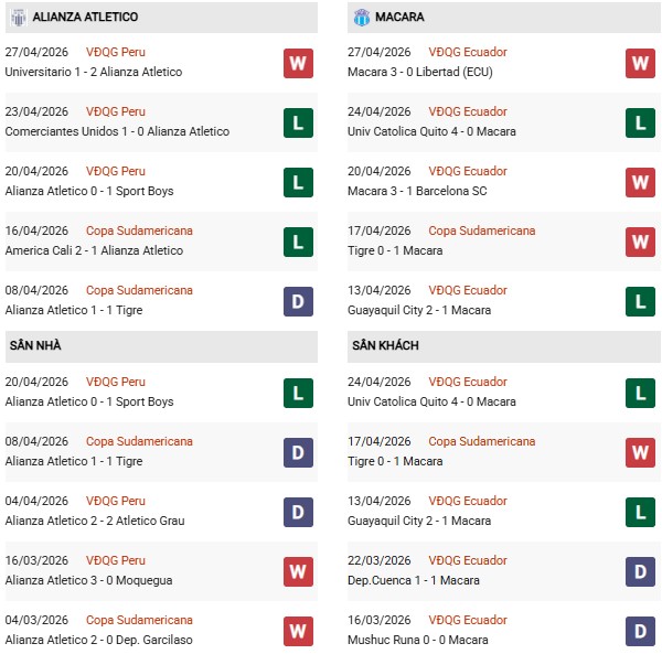 Nhận định Alianza Atletico vs Macara, 09h00 ngày 1/5, bảng A Copa Sudamericana, sân Miguel Grau. Macara cũng cho thấy họ khó chịu ra sao trong các chuyến làm khách dù đa phần bị đánh giá thấp hơn: tỷ lệ thất bại chỉ là 3/19 (không xét giao hữu).