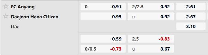 Thông tin tỷ lệ Anyang vs Daejeon Hana:
