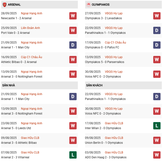 Thành tích đối đầu Arsenal vs Olympiakos: