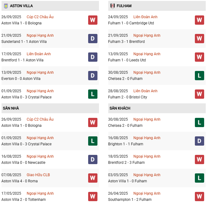 Thống kê phong độ Aston Villa vs Fulham: