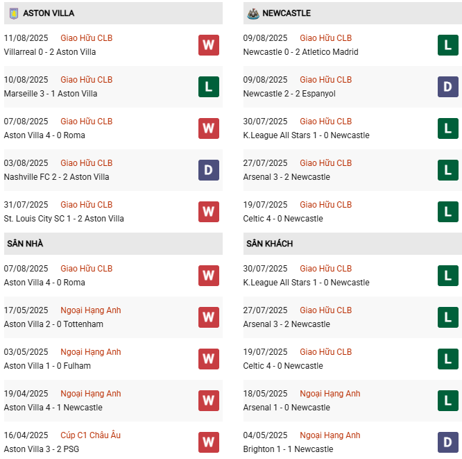 Thành tích đối đầu Aston Villa vs Newcastle: