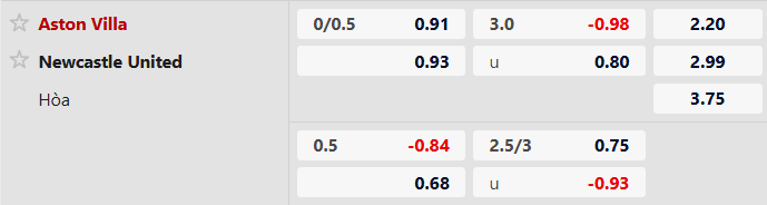 Thông tin tỷ lệ kèo bóng đá Aston Villa vs Newcastle: