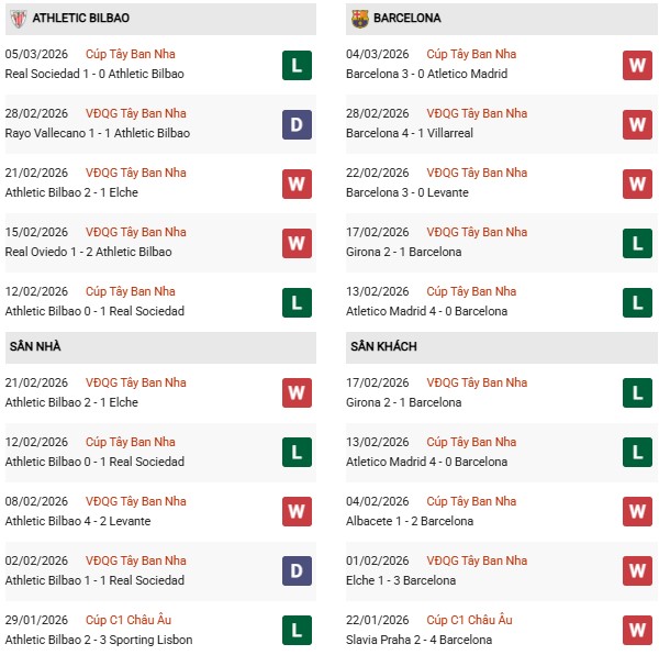 Thống kê phong độ Athletic Bilbao vs Barcelona: