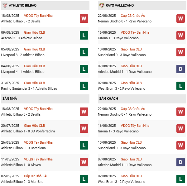 Thành tích đối đầu Athletic Bilbao vs Rayo Vallecano: