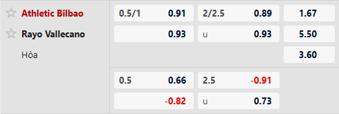 Athletic Bilbaođược đánh giá cao hơn nhiều với mức chấp 3/4 bàn. Athletic Bilbao cũng luôn có được ưu thế khi đụng độ Rayo Vallecano với 6 thắng lợi và 1 trận hòa sau 7 cuộc chạm mặt liên tiếp. Không thể phủ nhận việc Rayo Vallecano đang thể hiện khá tốt nhưng Athletic Bilbao với lợi thế sân nhà cùng dàn nhân sự vượt trội khả năng rất cao sẽ có cho mình thắng lợi ngay sau 90 phút.
