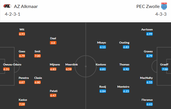Những trận đấu sân nhà gần đây của AZ Alkmaar thường diễn ra với thế trận rất cởi mở và hấp dẫn, khi 5/6 trận có tối thiểu 4 tình huống ghi bàn, trong đó các chân sút của họ ghi tới 21 bàn ở 6 trận đấu đó. Với Zwolle, hàng thủ đội khách lại để thủng lưới tới 10 bàn ở 4 trận vừa qua.