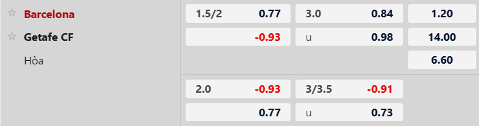 Barcelona được đánh giá rất cao, họ chấp 1 3/4 bàn cả trận. Barcelona có đội hình vượt trội và thành tích đối đầu tốt trước Getafe những năm gần đây. Bất chấp Getafe đang có sự tiến bộ ở mùa giải mới, họ vẫn rất khó để làm nên bất ngờ. Với phong độ thăng hoa, Barcelona được cho sẽ thắng từ cách biệt 2 bàn trở lên và vượt kèo châu Á.