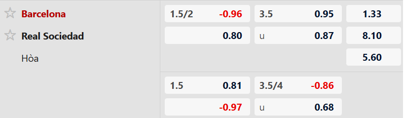 Thông tin tỷ lệ kèo Barcelona vs Real Sociedad: