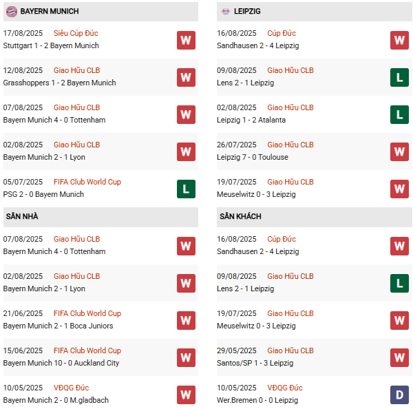 Thống kê phong độ Bayern Munich vs RB Leipzig: