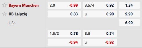 9/10 cuộc so tài gần nhất giữa Bayern Munich và RB Leipzig đều về kèo Tài chung cuộc với rất nhiều bàn thắng được ghi. 2 lần liên tiếp chạm mặt Đàn Bò trên thánh địa của mình, Hùm Xám đã có đến 7 pha lập công. Do đó, mức kèo tài xỉu 3 3/4 được niêm yết dù khá cao nhưng vẫn phù hợp dành cho sự xuất hiện của kèo Tài sau 90 phút đôi công hấp dẫn.