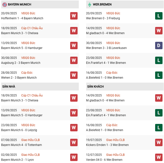 - Trên sân nhà, Bayern Munich thắng 8, thua 1 trước Werder Bremen.