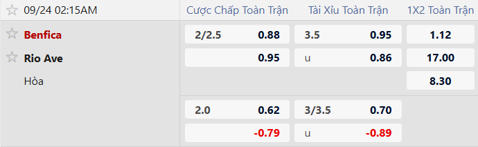Thông tin tỷ lệ kèo Benfica vs Rio Ave: