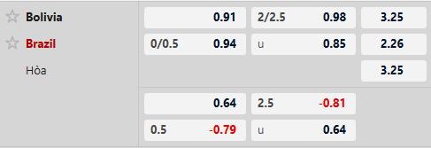 Thông tin tỷ lệ kèo bóng đá Bolivia vs Brazil: