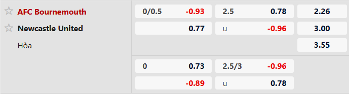 Bournemouth chấp 1/4 bàn cả trận. Bournemouth đã bất bại trước Newcastle ở mùa trước, hòa 1-1 trên sân nhà trong lần gặp nhau đầu tiên trước khi dễ dàng giành chiến thắng 4-1 trên sân khách. Với màn trình diễn ổn định ở lúc này, Bournemouth được giới chuyên môn đánh giá cao về khả năng giành lấy chiến thắng.