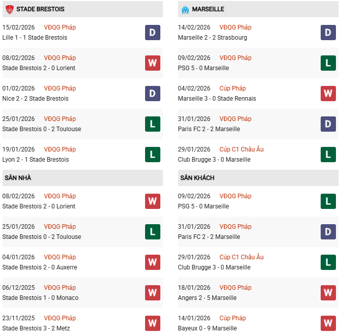 - Trên sân nhà, Brest thắng 2, thua 4 trước Marseille.