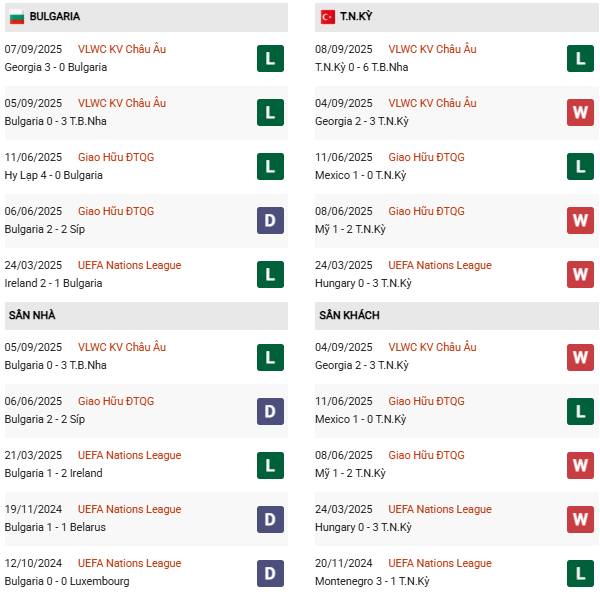 Thống kê phong độ Bulgaria vs Thổ Nhĩ Kỳ: