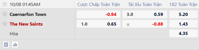 Thông tin tỷ lệ Caernarfon vs The New Saints: