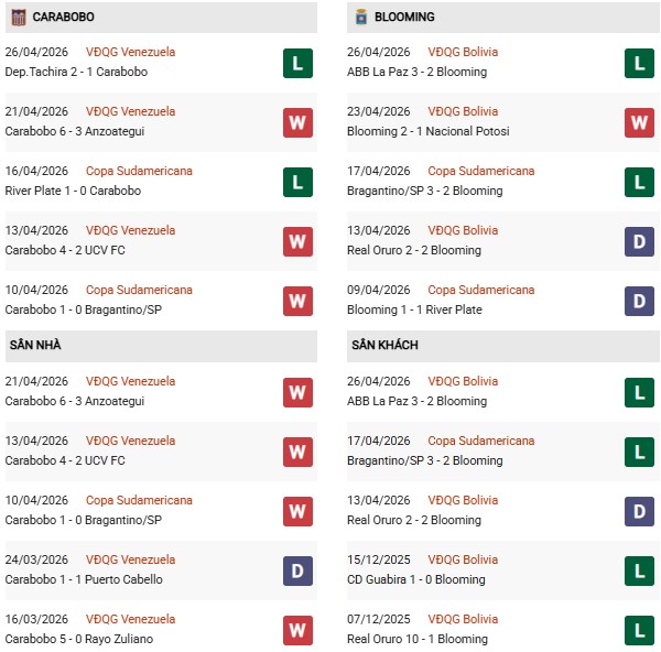 Thống kê phong độ Carabobo vs Blooming: