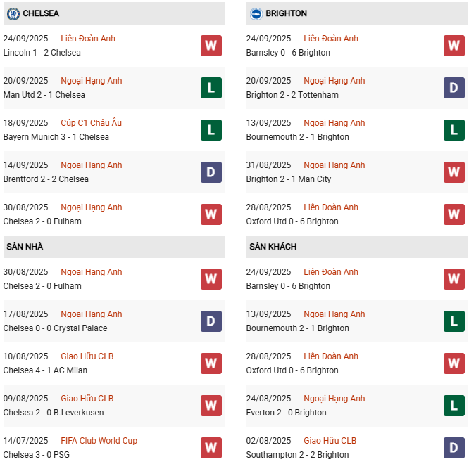 Vòng đấu vừa qua, Brighton thậm chí để Tottenham gỡ hòa 2-2 dù đã dẫn trước hai bàn, và hiện đã rơi xuống nửa dưới bảng xếp hạng. Brighton cũng nằm trong nhóm 4 đội chưa giành điểm nào trên sân khách mùa này. Dẫu vậy, ký ức tươi đẹp về 2 chiến thắng liên tiếp trước Chelsea tại FA Cup và Premier League hồi tháng 2/2025 chắc chắn sẽ tiếp thêm tự tin cho Seagulls.