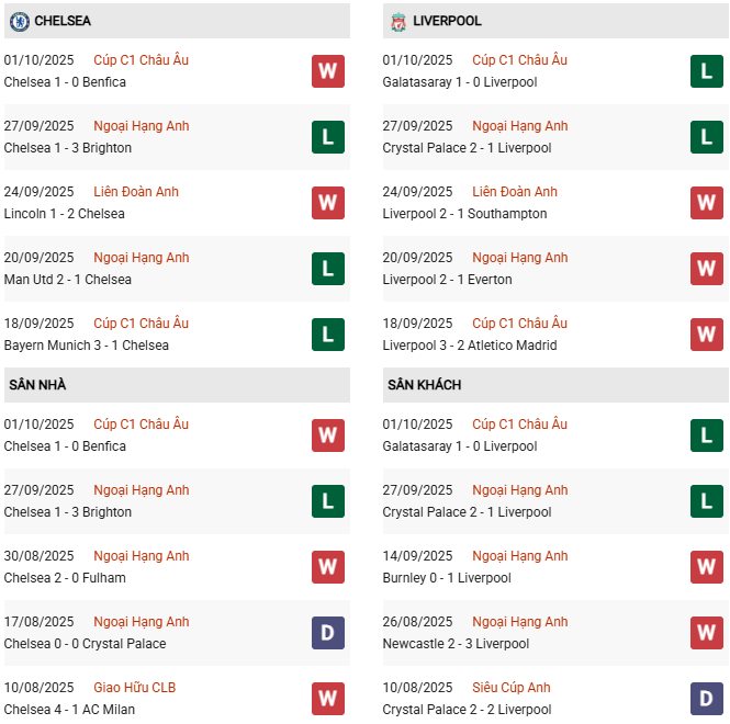 - Trên sân nhà, Chelsea thắng 2, thua 2 trước Liverpool.