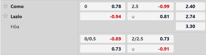 Thống kê cho thấy Como đang có hàng công khá ổn định, khi ghi được 3 bàn ở 5/6 trận đã chơi mùa này (tính cả loạt giao hữu). Phía bên kia, Lazio mùa trước sở hữu hàng công mạnh thứ ba Serie A, với hiệu suất trung bình 1.6 bàn mỗi trận. Đáng chú ý, 3/4 lần chạm trán gần nhất giữa hai đội đều chứng kiến cả hai cùng ghi bàn. Với mức Tài Xỉu 2 1/2, cửa Tài được đánh giá là lựa chọn sáng giá.