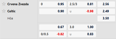 Crvena Zvezda có lợi thế sân nhà, nhưng không được đánh giá cao hơn Celtic. Mức kèo hòa được thua cho thấy họ là lựa chọn thiếu sự tin cậy, nhất là khi Celtic đang cho thấy phong độ ấn tượng xa phải xa nhà, họ thắng 2, hòa 2 trong 4 trận sân khách gần đây.