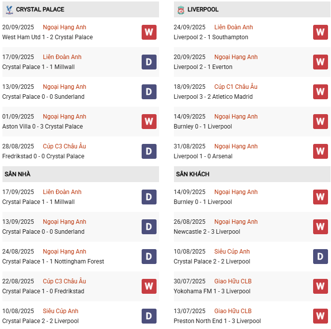 Thống kê phong độ Crystal Palace vs Liverpool: