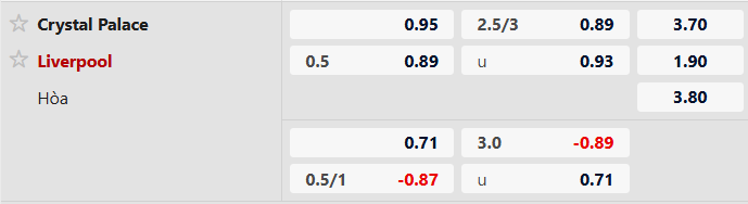 Thông tin tỷ lệ kèo bóng đá Crystal Palace vs Liverpool: