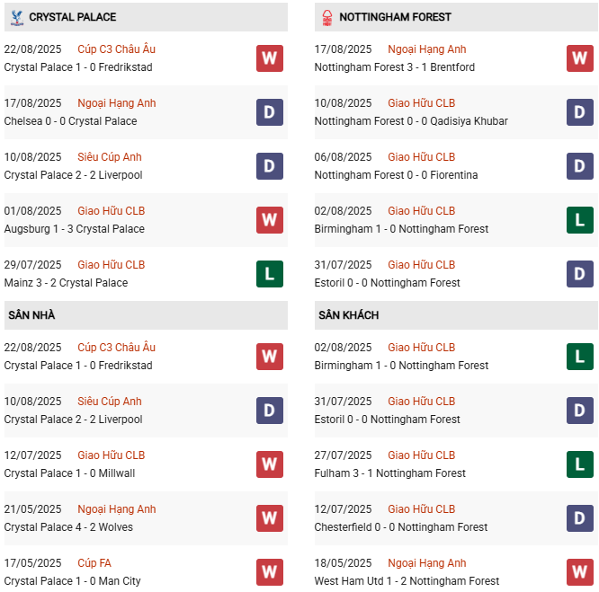 Thống kê phong độ Crystal Palace vs Nottingham: