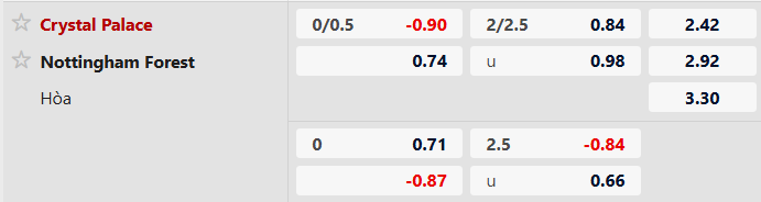 Lợi thế sân nhà cùng phong độ và tinh thần lên cao đang giúp Crystal Palace được xếp kèo trên với mức chấp 1/4 bàn. Khó tin nhưng Crystal Palace đã có hơn 10 năm không thắng được Nottingham với 6 trận hòa và 4 thất bại sau 10 cuộc đụng độ. Tuy nhiên, ở thời điểm đội khách đang gặp nhiều vấn đề, không ngạc nhiên nếu Đại Bàng có thể thành công giữ 3 điểm ở lại với thánh địa của mình.