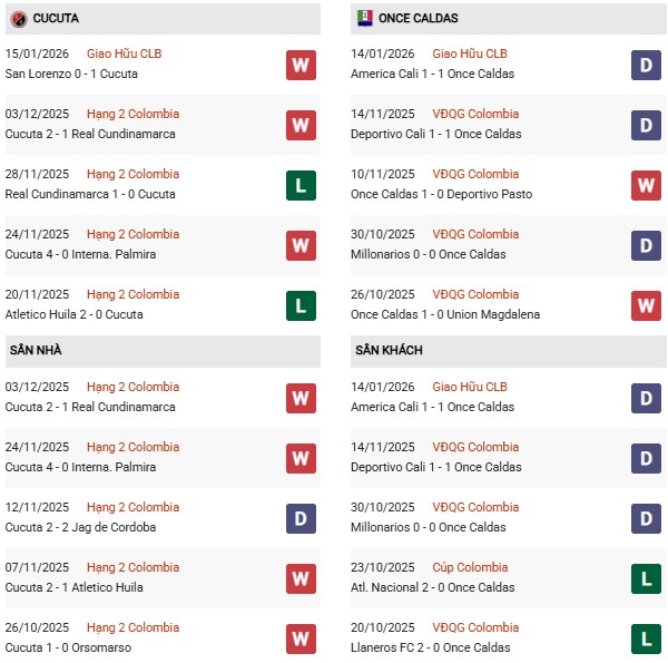 Once Caldas thường lựa chọn cách tiếp cận an toàn, nhất là khi phải thi đấu xa nhà. Thống kê cho thấy trong 10 chuyến làm khách gần đây, họ thắng 2, hòa 5 và thua 3, tỷ lệ hòa khá cao cho thấy xu hướng chơi chắc chắn, chấp nhận chia điểm nếu không có lợi thế. Điều này có thể khiến Once Caldas gặp khó trước một Cucuta đang rất hưng phấn ở ngày ra quân.