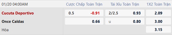 Thông tin tỷ lệ Cucuta vs Once Caldas: