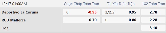 Thông tin tỷ lệ cược Deportivo vs Mallorca: