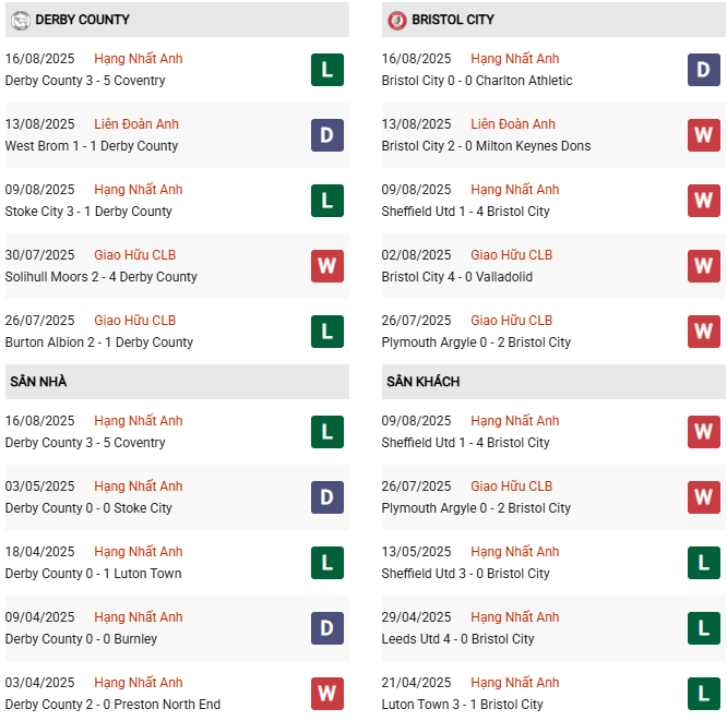 Thống kê phong độ Derby County vs Bristol City:
