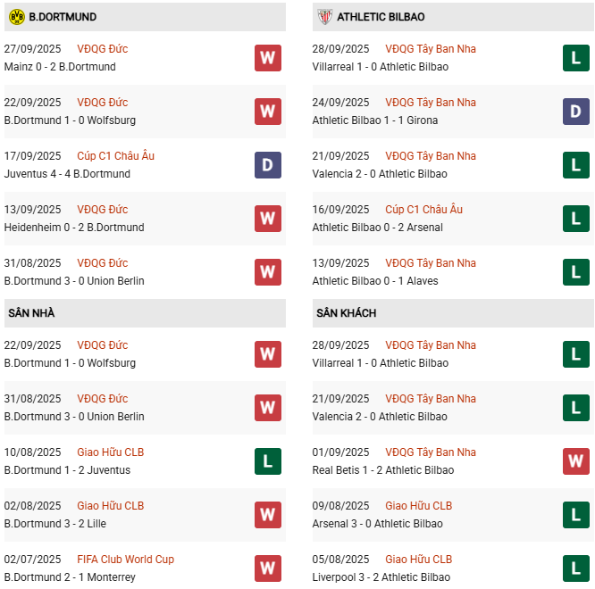 - Dortmund thua cả 2 trận đối đầu Bilbao gần đây.