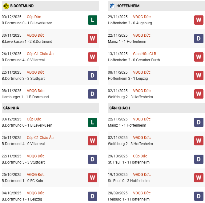 Thống kê phong độ Dortmund vs Hoffenheim: