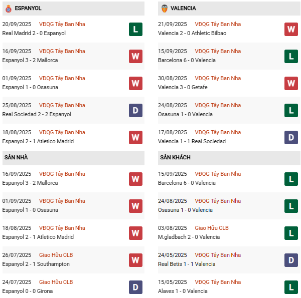 Thống kê phong độ Espanyol vs Valencia: