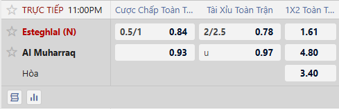 Esteghlal chấp 3/4 bàn ở trận này. Mức kèo này là không hợp lý khi xét đến sự chênh lệch quá lớn về phong độ gần đây của hai đội. Esteghlal đang là một "ngân hàng bàn thắng" sau trận thua 1-7, và Al-Muharraq đang sở hữu hàng công hiệu quả. Dù phải đá sân khách, cửa thắng của Al-Muharraq vẫn sáng hơn rất nhiều.