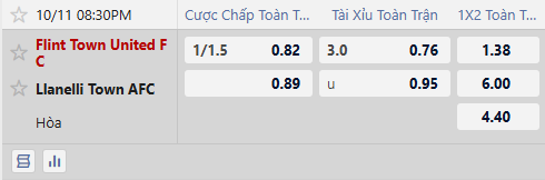 Điểm ăn ở cửa Tài 3 đã giảm xuống còn 0.76. Động thái này cho thấy niềm tin dồn vào cửa Tài ngày một tăng cao. Thống kê cho thấy 16/20 trận gần đây của Flint Town United và 5/8 trận gần đây của Llanelli nổ Tài. Trận lượt đi của hai đội chứng kiến tới 5 bàn.