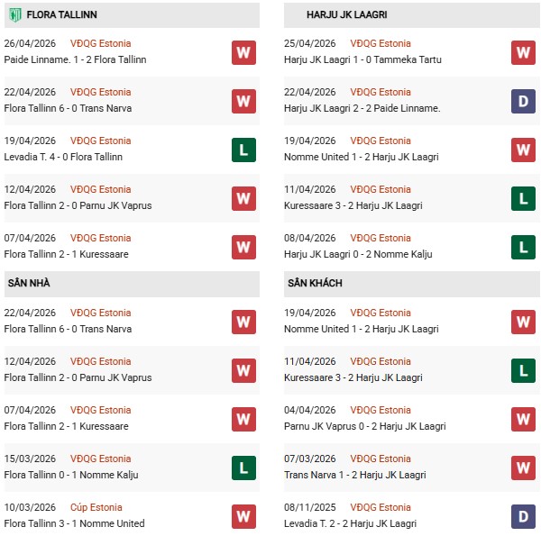 - Trên sân nhà, Flora Tallinn toàn thắng cả 4 trận trước Harju JK.