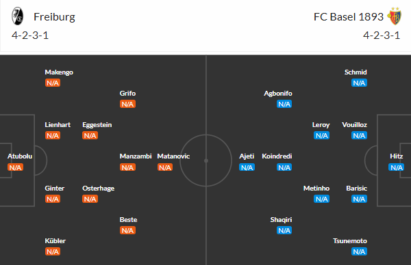 - Freiburg thắng 3, hòa 1, thua 2 trong 6 trận gặp Basel gần đây.