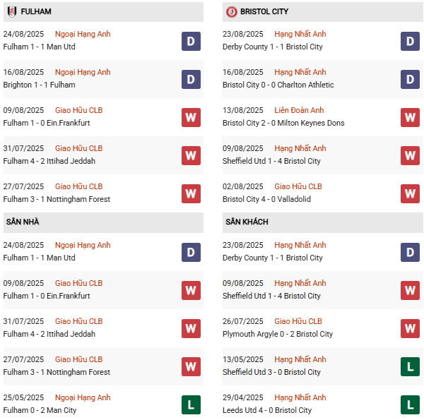 - Trên sân nhà, Fulham thắng 1, thua 5 trước Bristol City.