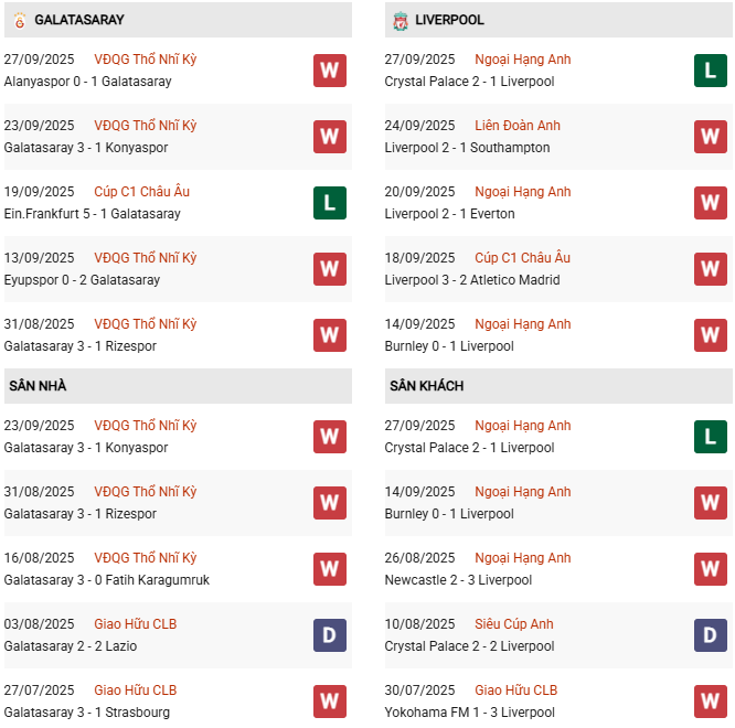 - Trên sân nhà, Galatasaray thắng 3, hòa 1 trước Liverpool.